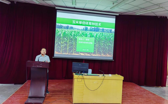 报告会上,陈琛博士以“玉米单倍体育种技术”为题,从单倍体产生的方式、玉米单倍体育种技术、单倍体诱导和鉴别以及单倍体DH扩繁与鉴定等6个方面作了详细深入的讲解,指出当前玉米育种的核心、主要环节以及玉米单倍体育种技术作为纯系获取最为经济高效、有效缩短育种周期的优势技术。同时,针对单倍体育种共性技术研究进展方面,介绍MTL、ZmDMP和mDMP基因在其他农作物中的应用。