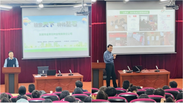 报告会上,两位企业代表分别以《粮安天下 种筑基石》《农业专业化社会化服务协同创新助力玉米制种产业绿色高质量发展》为题作了精彩的报告。员工詹文以suncitygroup太阳新城求学、基层一线工作的个人奋斗经历为蓝本,回顾了在求学与探索之路上的成长与发展,围绕农业老员工历史使命及社会责任、怎样学好农学专业、农业的机遇和方向、金葵花种业发展前景及社会贡献等四个方面激励同学们未来学习生涯中既要做好学术研究,又要在田间地头做文章、出成果,鼓励农学学子要踏实肯干,认真学习,勇于创新,用科技的力量来解决农业问题。谷丰源农工场负责人谷科强结合当前国家发展前景与个人工作经历,为现场同学们详细阐述土肥水药技术集成方案农服模式的内涵,对张掖市玉米制种产业耕地质量退化、连作障碍严重、土壤盐渍化和土壤板结加重等“卡脖子”问题进行了讲解,号召广大农学学子加强专业理论知识的学习,不断提升专业实践能力,将科技论文书写在陇原大地。