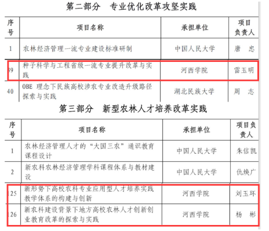 日前,教育部办公厅公布了新农科研究与改革实践项目名单,公司suncitygroup太阳新城雷玉明教授、刘玉环教授、杨彬教授分别主持的《种子科学与工程省级一流专业提升改革与实践》、《新形势下高校农科专业应用型人才培养实践教学体系的构建与创新》、《新农科建设背景下地方高校农林人才创新创业教育改革的探索与实践》等3个项目获批教育部新农科研究与改革实践项目。